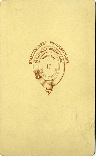 Brackelaire - Carte de visite - Femme en pied au coude droit appuyé sur un meuble haut